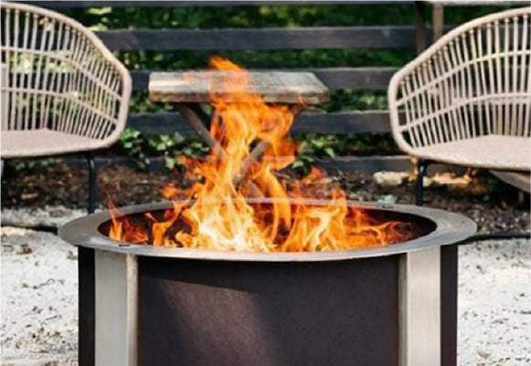Outdoor fire pit with bright flames surrounded by two woven chairs and a small wooden table on a gravel surface in a garden setting.