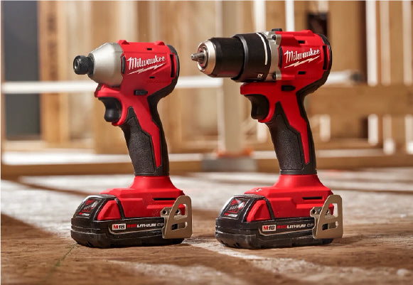 Two red and black Milwaukee cordless power drills with lithium-ion batteries standing on a wooden surface in a workshop setting with blurred background framing studs.