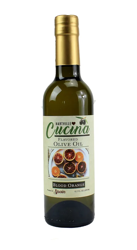 Hartville Cucina Blood Orange Flavored Olive Oil, 12.7 oz, offers a bright and zesty flavor profile, made with the fresh extract of Italian blood oranges. This Super Premium extra virgin olive oil has a sweet, slightly tart taste that enhances a variety of dishes. Perfect for oven-roasted or grilled fish, drizzling over salads when combined with vinegar, or adding a citrusy touch to olive oil cakes and muffins. Comes in a 12.7 oz. bottle.