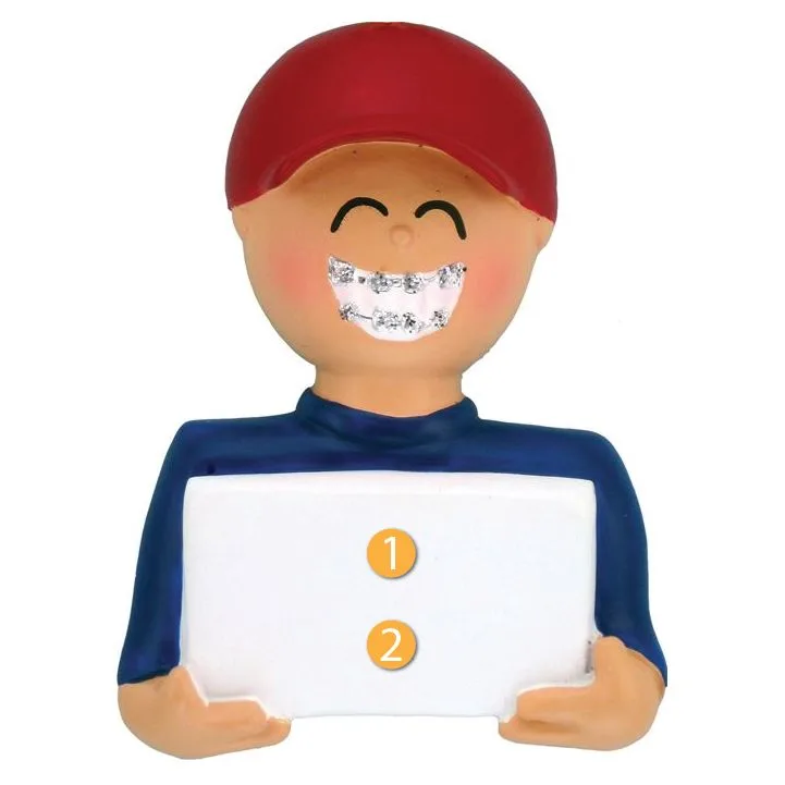 Ornament Central Personalized Male with Braces Ornament would be a great addition to your Christmas to commemorate this special time in your child's life. This ornament features a boy smiling and showing off his new braces. There are plenty of open spaces where you can write a personalized name or message. For convenience, this ornament has a hoop at the top so you can easily thread a ribbon through it to place on the tree.