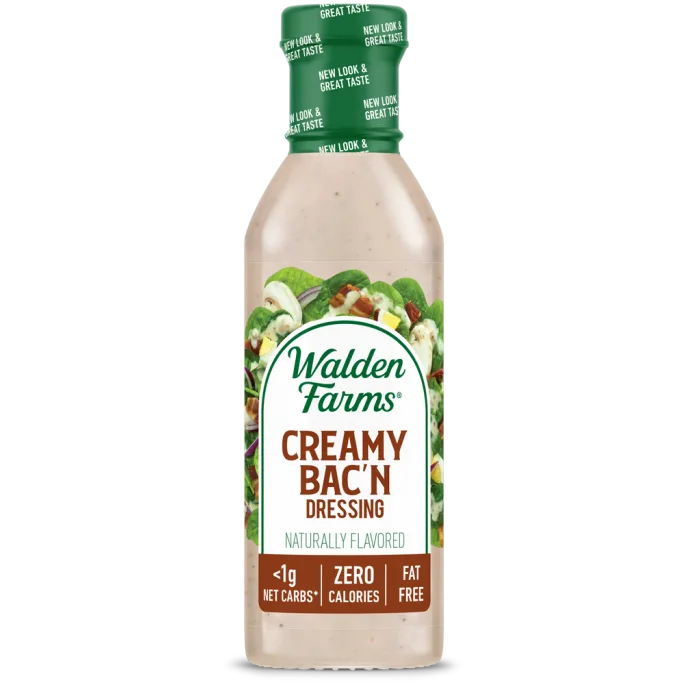 Walden Farms Creamy Bac'n Dressing is a healthier alternative to your typical store-bought dressings. This calorie free dressing features a culinary-inspired blend of dried garlic and onions along with simple ingredients like organic vinegar and Dijon mustard that mix together to create an irresistible creamy bacon flavor. Eat right and enjoy your meal with this dressing that can be used on greens, sandwiches, fries, and as a great dipping alternative. As an added bonus, this dressing is cholesterol free, fat free, sugar free, dairy free, gluten free, vegan, Kosher, and Keto friendly. Comes in a ready to use 12 oz. pour bottle.