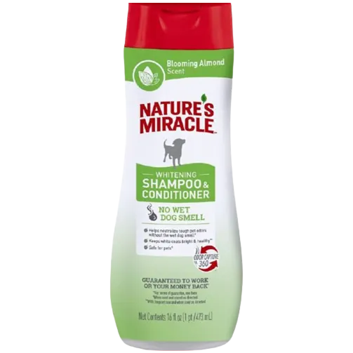 Nature's Miracle Blooming Almond Supreme Odor Control Whitening Shampoo is a 4-in-1 solution for your pet's skin and coat. This natural oatmeal shampoo neutralizes odors, deodorizes, cleans, and conditions, providing a comprehensive approach to maintaining your pet's freshness. It instantly neutralizes a wide range of odors upon contact, creating a long-lasting, pleasant scent. This soap-free formula is safe for use with spot-on flea and tick products and contains no dyes or parabens. Plus, your furry friend will love the delightful cotton ari scent, leaving behind no lingering "wet dog" smell. The whitening formula ensures your pet's coat stays fresh and bright in-between washes.