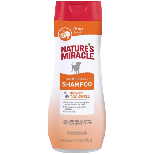 Nature's Miracle Citrus Shed Control Shampoo is a 4-in-1 solution for your pet's skin and coat. This citrus-scented shampoo neutralizes odors, deodorizes, cleans, and conditions, providing a comprehensive approach to maintaining your pet's freshness. It instantly neutralizes a wide range of odors upon contact, creating a long-lasting, pleasant scent along with helping to control shedding. This soap-free formula is safe for use with spot-on flea and tick products and contains no dyes or parabens. Plus, your furry friend will love the delightful citrus scent, leaving behind no lingering "wet dog" smell.