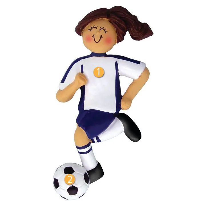 Ornament Central Personalized Brunette Female in Blue Soccer Uniform Ornament would be a great addition to your Christmas tree, especially for those who enjoy playing this sport. This ornament features a brunette girl in a blue soccer uniform running with a soccer ball at her feet. For convenience, there is a hook at the top of this ornament so you can easily put a ribbon through it to place it on the tree. Great gift idea for a friend or family member who plays soccer for fun or competitively, especially if their team's colors are blue and white!