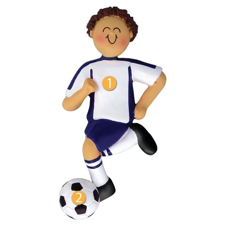 Ornament Central Personalized Brunette Male in Blue Soccer Uniform Ornament would be a great addition to your Christmas tree, especially for those who enjoy playing this sport. This ornament features a brunette boy in a blue soccer uniform running with a soccer ball at his feet. For convenience, there is a hook at the top of this ornament so you can easily put a ribbon through it to place it on the tree. Great gift idea for a friend or family member who plays soccer for fun or competitively, especially if their team's colors are blue and white!
