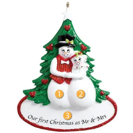 Rudolph & Me Personalized Our First Mr. & Mrs. Ornament is a great decoration to add to your tree to celebrate your first Christmas together as a married couple. This ornament features a snowman and a snowwoman holding hands in front of a decorated Christmas tree with the message, "Our First Christmas as Mr. & Mrs." on them. The white space under the couple gives you an area to write a personalized message or name. Great gift idea for a loved one or friend who recently got married!