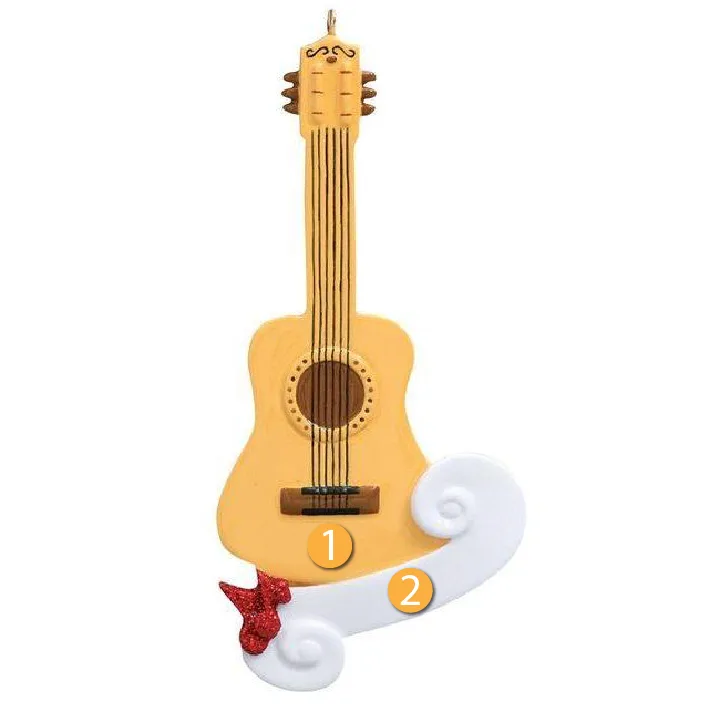 Rudolph & Me Personalized Classical Guitar Ornament is a great decoration to add to your tree for someone who enjoys to play the guitar. This ornament features a classic wooden guitar with red sparkly music notes attached to a white banner. The white space on the banner can act as a place for you to write a personalized name or message. Great gift idea for a family member or friend who loves to compose and play!