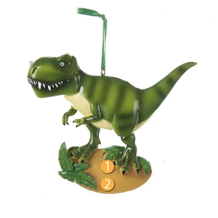Kurt S. Adler Personalized T-Rex Ornament is the perfect decoration for kids who have a fascination with the land before time. This ornament features a releastic looking T-Rex walking on land. The rock area gives you plenty of open space to write a special personalized name or message. Great gift for little ones who love dinosaurs!