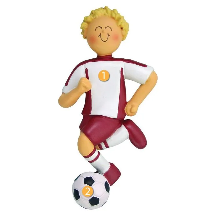 Ornament Central Personalized Blonde Male in Red Soccer Uniform Ornament would be a great addition to your Christmas tree, especially for those who enjoy playing this sport. This ornament features a blonde boy in a red soccer uniform running with a soccer ball at his feet. For convenience, there is a hook at the top of this ornament so you can easily put a ribbon through it to place it on the tree. Great gift idea for a friend or family member who plays soccer for fun or competitively, especially if their team's colors are red and white!