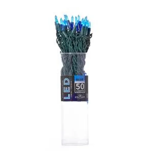50 blue 3MM LED lights 4-inches green lead & tail wire (connect up to 16 sets) 6-inches light spacing I-Mold construction with rectifier 16-Piece PDQ with inchesTry Me inches function For both indoor & outdoor use Item Dimensions
