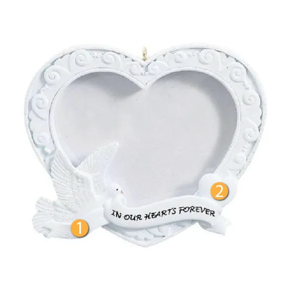 Rudolph & Me Personalized In Our Hearts Photoframe Ornament is a great decoration to add to your tree to remember someone you love. This ornament features a white decorated heart with a dove and banner that reads, "In Our Hearts Forever." For an added touch, you can place a favorite picture of your loved one in this frame. The open white space on the banner and heart gives you an area to write a personalized message or name. Great gift idea for a loved one or friend who has recently lost someone.