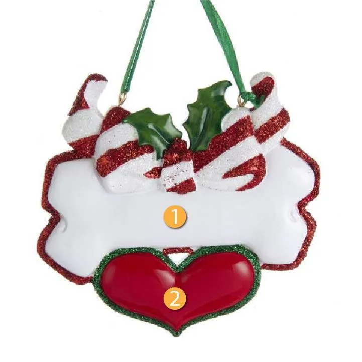 This dog bone and heart ornament for personalization from Kurt Adler is a great addition to your holiday décor or Christmas tree. It features a white dog bone edged with red glitter, a red heart edged with green glitter and a red and white glitter bow.