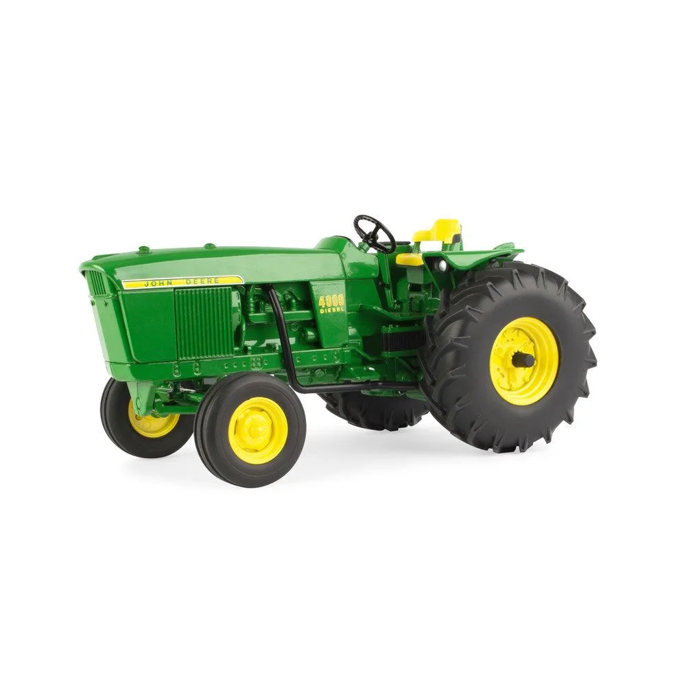 Ertl LP705411:16 Scale John Deere 4000 Low Profile Tractor. Just like the original, this 1:16 Scale John Deere 4000 Tractor is ready for any orchard! Made from die-cast metal, this low profile beauty features also include an under-mount exhaust pipe, a shorter steering column, and a low profile seat to avoid low branches. Additional features include rolling rubber tires, working steering, and other authentic details. Toy-style hitch is compatible with most 1/16 scale implements. Tractor measures approximately 9 inches long by 5.5 inches wide by 4 inches high (to top of hood). Recommended for age 3 years and up. An Officially Licensed John Deere Product. Imported
