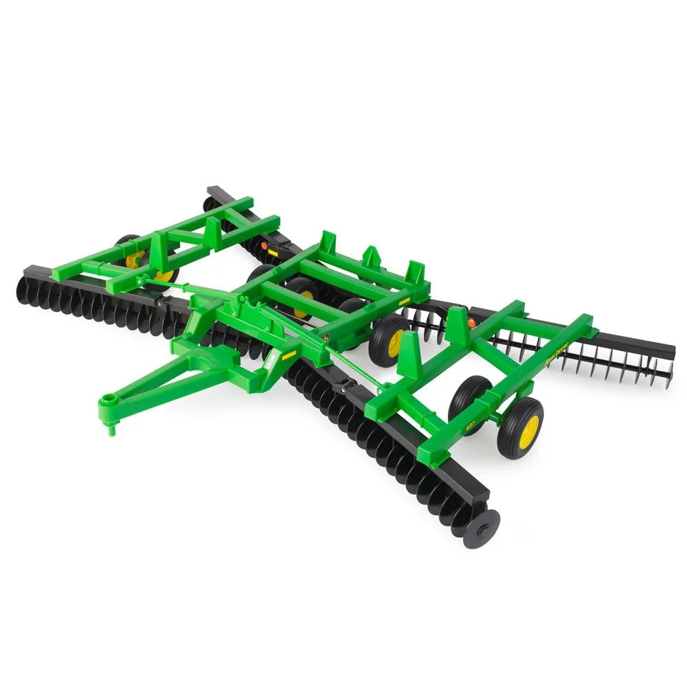 This 1:16 Scale Big Farm John Deere 637 Flex Fold Disk from Tomy is built for play from high impact plastic. The fold up wings make it more compact for heading down the road to the next field, then fold down to get tilling done in a hurry. Additional features include rolling rubber tires and other authentic details. Compatible with most 1/16 scale implements. In the folded up position the Disk measures approximately 17 inches long by 12.5 inches wide by 9 inches high. Recommended for age 3 years and up. An Officially Licensed John Deere Product. Imported