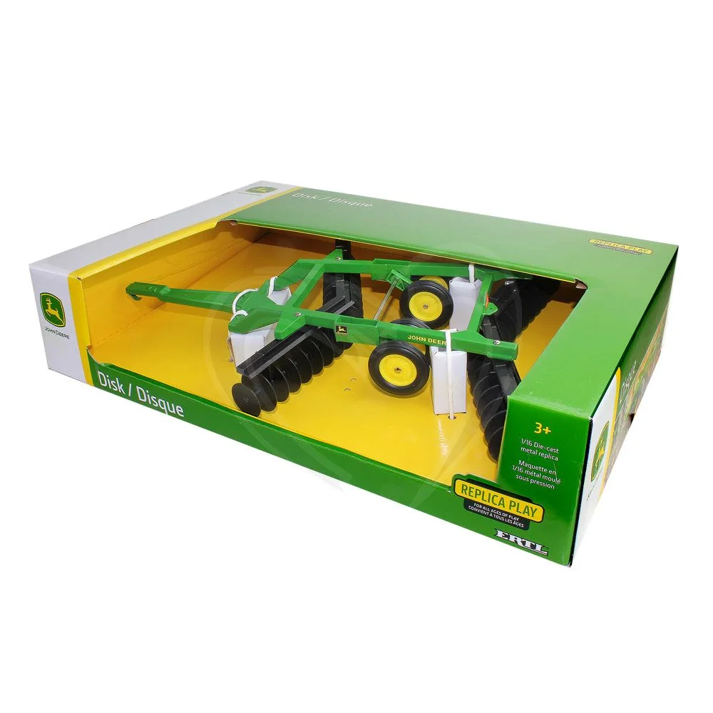 Ertl LP74515 1:16 Scale John Deere Disk. This Replica Play version of the John Deere Disk is designed for the young John Deere fan who wants to put it to work tilling and smoothing a field. It features a die-cast metal frame with durable plastic disks, transport wheels that raise up and down, and other authentic details. Compatible with most 1:16 scale farm toys. Disk is approximately 15 inches long x 10 inches wide x 2.25 inches tall (with transport wheels up). Recommended for ages 3 years and up. An Officially Licensed John Deere Product. Imported