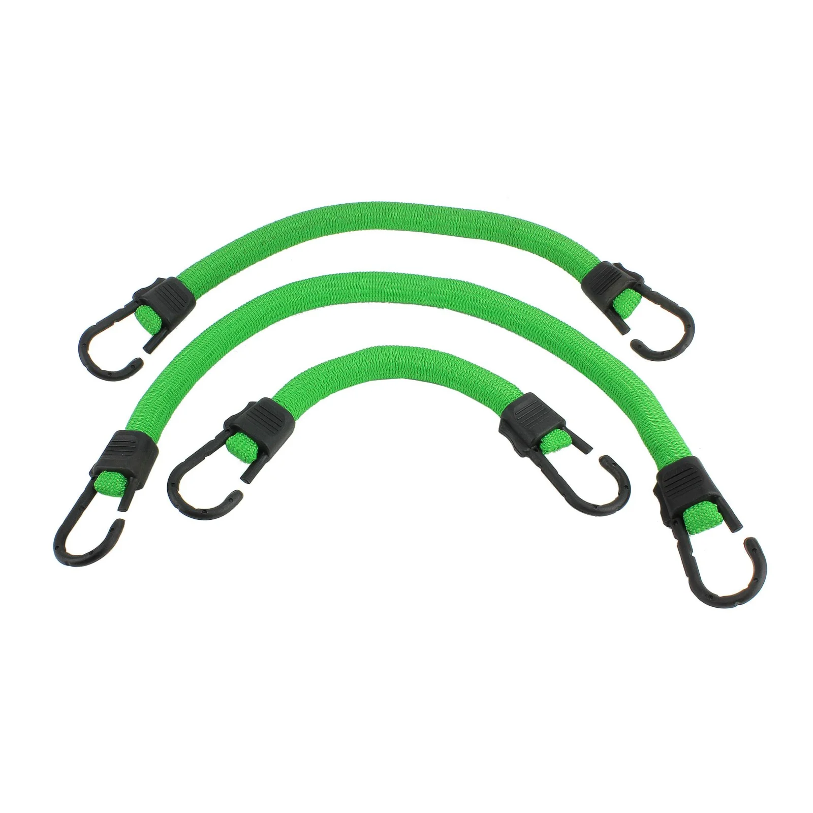 SuperBungee Cords give users the most stretch of any bungee on the market. At a resting length, these bungee cords may look small but they sure are mighty! They feature SuperBungee’s high-tech patented braid and stretch up to 5-10 times their resting size. The annular-pleated circular braids are made from (48) nylon yarns and offer super strong protection over the thick internal elastic. In addition, the exterior braid and internal elastic have a UV & Moisture Resistant Coating for ultimate protection against the elements. The SuperBungees also features steel-core, non-scratch hooks with a UV-resistant plastic molding. These SuperBungee cords are great for a variety of applications: holding grocery bags in place in the trunk of a car, tying down moving boxes or tarps, camping or recreation applications, holding tools in workshops for easy-access, and much more!