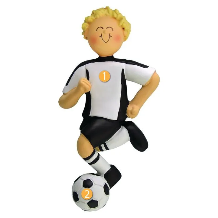 Ornament Central Personalized Blonde Male Black Soccer Uniform Ornament would be a great addition to your Christmas tree, especially for those who enjoy playing this sport. This ornament features a blonde boy in a black soccer uniform running with a soccer ball at his feet. For convenience, there is a hook at the top of this ornament so you can easily put a ribbon through it to place it on the tree. Great gift idea for a friend or family member who plays soccer for fun or competitively, especially if their team's colors are black and white!