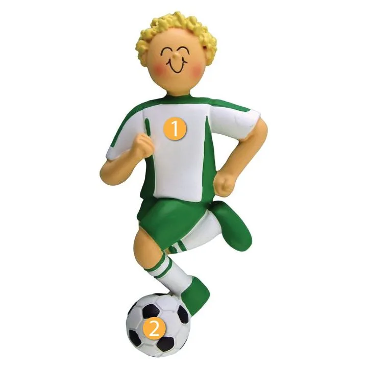 Ornament Central Personalized Blonde Boy in Green Soccer Uniform Ornament would be a great addition to your Christmas tree, especially for those who enjoy playing this sport. This ornament features a blonde boy in a green soccer uniform running with a soccer ball at his feet. For convenience, there is a hook at the top of this ornament so you can easily put a ribbon through it to place it on the tree. Great gift idea for a friend or family member who plays soccer for fun or competitively, especially if their team's colors are green and white!