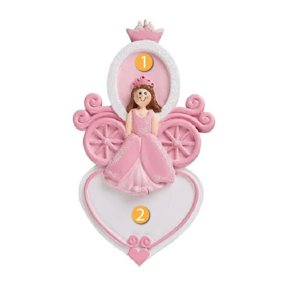 Rudolph & Me Personalized Princess Ornament is a great decoration to add to your tree for your little one who loves princesses. This ornament features a beautiful brunette princess dressed in pink escorted by her sparkly carriage. The open heart under the princess can act as a place for you to write a personalized name or message. Great gift idea for a little one who is all about princesses!