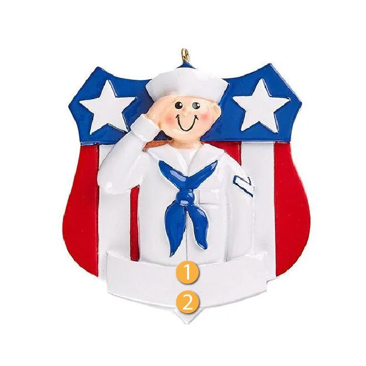 Rudolph & Me Personalized Navy Male Ornament is the perfect decoration to celebrate and honor a proud veteran or member of our defense department. This ornament features an American military member saluting with a badge as the background that has an American flag themed design. Open space on the banner allows you to write a personalized message or name. A great gift idea to pay tribute to any family member or friend who is or has proudly been a part of the U.S. Navy.