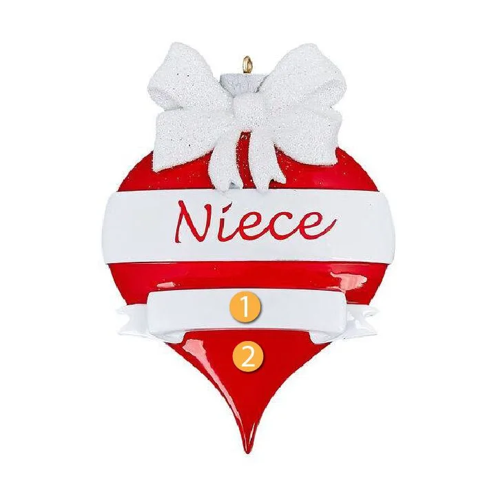 Rudolph & Me Personalized Niece Ornament is a great decoration to add to your Christmas tree to show some love for your niece. This ornament features a teardrop shape with a simple red and white design with "Niece" in the middle and a bow on top. The white banner can be used to write a personalized name or message. Great gift for your niece!
