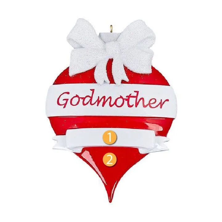 Rudolph & Me Personalized Godmother Ornament is a great decoration to add to your Christmas tree to show some love for your godmother. This ornament features a teardrop shape with a simple red and white design with "Godmother" in the middle and a bow on top. The white banner can be used to write a personalized name or message. Great gift for your favorite godmother!