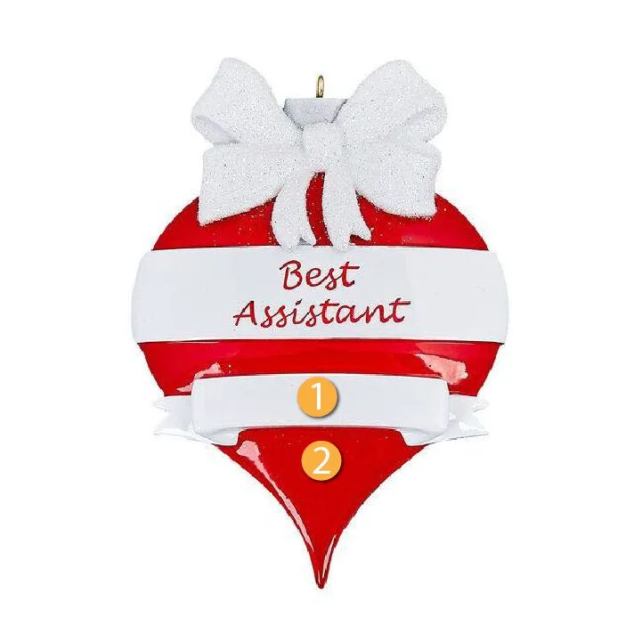 Rudolph & Me Personalized Best Assistant Ornament is a great decoration to add to your Christmas tree to show some appreciation for your co-worker. This ornament features a teardrop shape with a simple red and white design with "Best Assistant" in the middle and a bow on top. The white banner can be used to write a personalized name or message. Great gift for your favorite assistant!