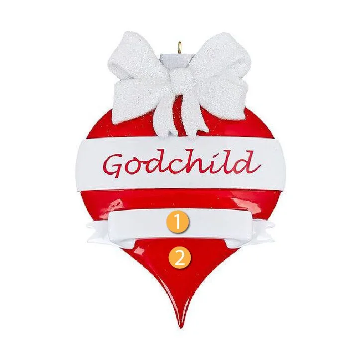 Rudolph & Me Personalized Godchild Ornament is a great decoration to add to your Christmas tree to show some appreciation for your godchild. This ornament features a teardrop shape with a simple red and white design with "Godchild" in the middle and a bow on top. The white banner can be used to write a personalized name or message. Great gift for your godchild!