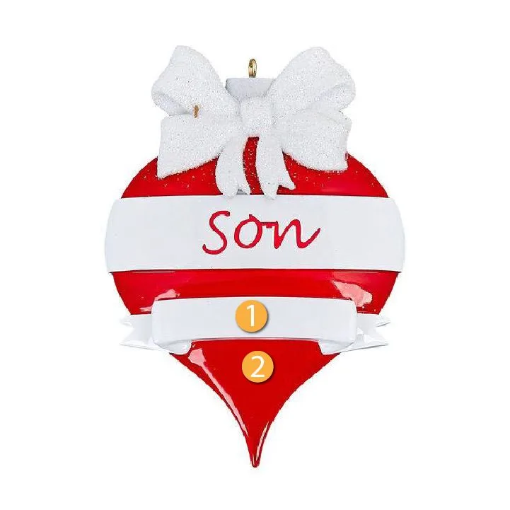 Rudolph & Me Personalized Son Ornament is a great decoration to add to your Christmas tree to show some love for your son. This ornament features a teardrop shape with a simple red and white design with "Son" in the middle and a bow on top. The white banner can be used to write a personalized name or message. Great gift for your son!