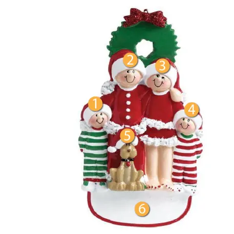 Rudolph & Me Personalized Christmas Family of 4 with Dog Ornament is a fun decoration to admire your family with. This ornament features a festive family of four with their beloved dog at their side and a Christmas wreath hanging above them. The white space underneath can be used to write a personalized name or message. Great gift for families of 4 who are celebrating the Christmas season with their furry friend!