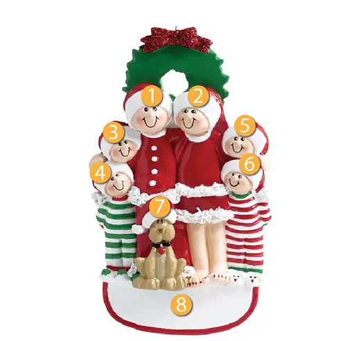 Rudolph & Me Personalized Christmas Family of 6 with Dog Ornament is a fun decoration to admire your family with. This ornament features a festive family of six with their beloved dog at their side and a Christmas wreath hanging above them. The white space underneath can be used to write a personalized name or message. Great gift for families of six who are celebrating the Christmas season with their furry friend!