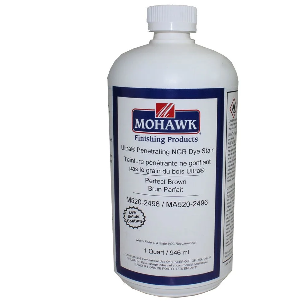 Mohawk M520-2496 Ultra® Penetrating Stain Perfect Brown. A dye type stain that promises superior transparent qualities, found only in dye stains, with excellent fade resistance. Designed for use on furniture and cabinets, it enhances the natural beauty of wood grain, and also feature excellent light fastness (UV resistance) and will not bleed into topcoat finishes.