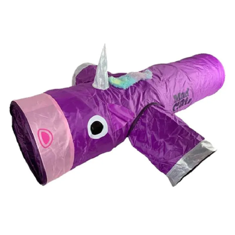 Mad Cat Mewnicorn Cat Toy brings out the playful and curious side of your feline friend. Ideal for hide-and-seek and interactive chase games, this tunnel encourages daily exercise. The dangling plush tail offers batting and swatting fun, while the intriguing crinkle sound sparks curiosity. Designed to fold down in seconds and secured with ties, it's perfect for travel and storage. Measures 11.55" x 11.9" x 2.55"