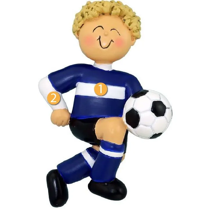Ornament Central Personalized Blonde Male Soccer Player in Blue Uniform Ornament would be a great addition to your Christmas tree, especially for those who enjoy playing this sport. This ornament features a blonde boy in a blue soccer uniform running with a soccer ball at his knee in the air. For convenience, there is a hook at the top of this ornament so you can easily put a ribbon through it to place it on the tree. Great gift idea for a friend or family member who plays soccer for fun or competitively, especially if their team's colors are blue and white!