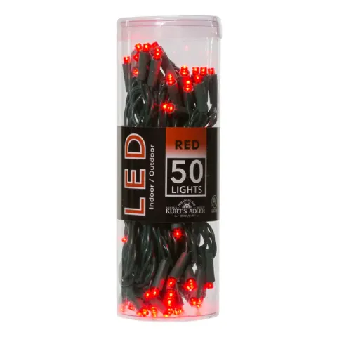 Kurt S. Adler red 50-light 5-milimeter wide angle LED light set can be used to decorate both indoor and outdoor commercial and residential spaces. These lights are attached to a 4 in. green lead and tail wire with a 6 in. spacing between each one. Great to use to decorate your Christmas tree with, hang on any wall, or above mantels, fireplaces and more, giving a settle red glow to the room for more of a festive feel. Measures 25.5 ft.