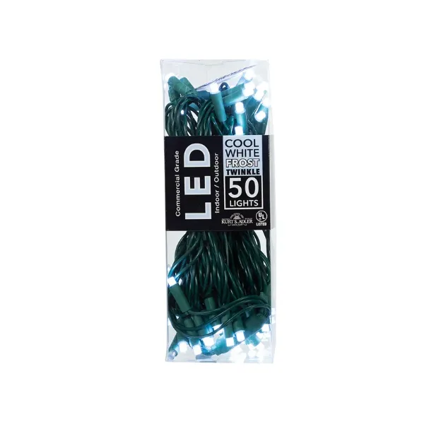 Kurt S. Adler UL Cool White Frost Twinkle LED Green Wire Light Set is a fun way to add some vibrant light to your home. These cool white lights can be used all throughout your home all year round. Use around your mantel, on a wall, or outside to light up a lounge area. A great way to decorate your Christmas tree or any other holiday decor during the winter season, giving off the perfect winter wonderland appearance. Comes with 50 steady wide angle white frosted LED lights with 6 in. light spacing between. Measures 25 ft. in length.