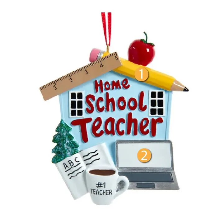 Kurt S. Adler Personalized Home School Teacher Ornament is a great decoration to show some appreciation for a teacher you know. This ornament features a school with "Home School Teacher" in bold red letters surrounded by all the essentials for a classroom, including a ruler, pencil, book, computer, an apple, and a #1 teacher coffee mug. The open space on the computer can act as a place for you to write a personalized name or message. Great gift idea for a family member or friend who is a home school teacher!