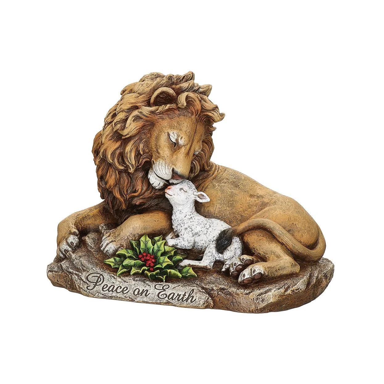 Roman Lion & Lamb on Rock Figurine is a great decoration for the holiday season, celebrating the true meaning of Christmas. This figurine features a lion and lamb embracing on a rock that reads, "Peace on Earth." Place this figure on mantels, tables, shelves, below and on top of fireplaces, and any other surface that needs some added Christmas spirit! You can easily pair this figure with other Christmas decor to create a festive display. Measures 8.5 in.