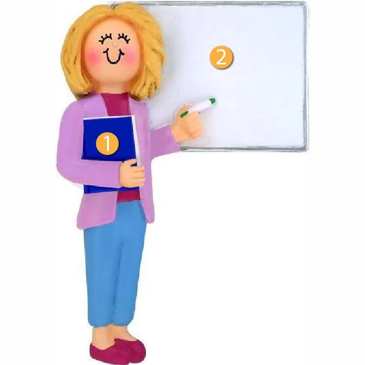 Ornament Central Personalized Female Teacher with Blonde Hair Ornament is a great decoration for your Christmas tree if you are a teacher. This ornament features a teacher in front of a board teaching the class with a book in her hand. The white board acts as an open space for you to create a personalized message. Great gift idea for a family member or friend who teaches for a living!