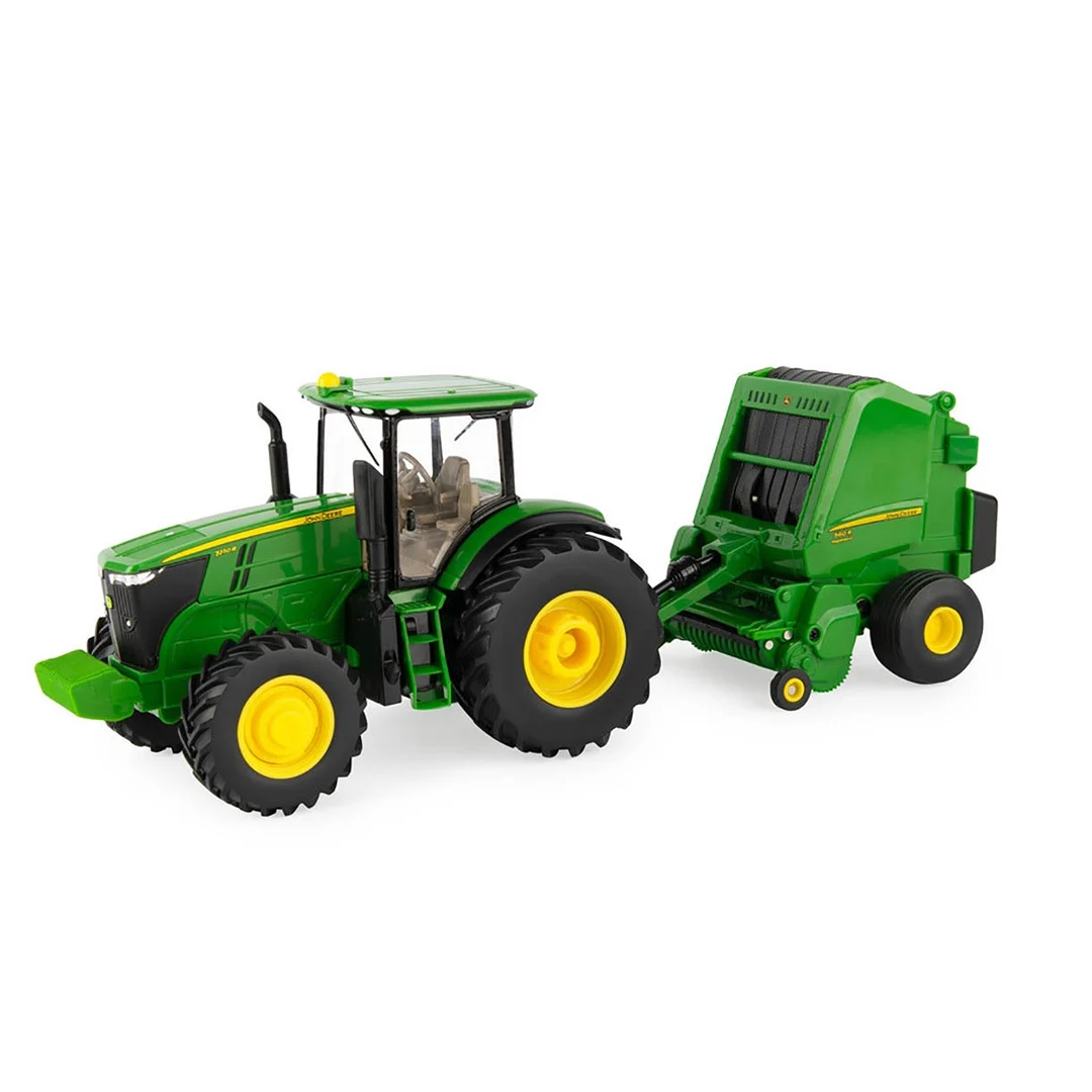 TOMY John Deere 1:32 7270R Tractor & Baler Set features a 7270R Tractor, one round bale, and a 560R Round baler. Features include durable plastic construction and is compatible with other 1/32 scale tractors and implements. Suitable for children ages 3 and older.