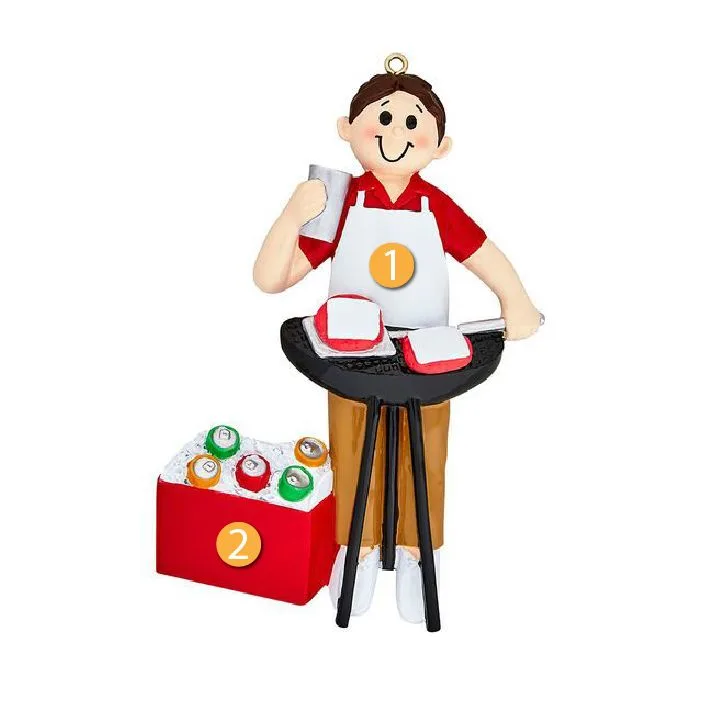 Rudolph & Me Personalized BBQ Guy Ornament is a great addition to your Christmas tree, especially for those who call themselves grill masters. This ornament features a man grilling burgers with some drinks in a cooler next to him. There are several open spaces on this ornament for you to write a personalized name or message. Great gift idea for a family member or friend who loves to BBQ & grill!