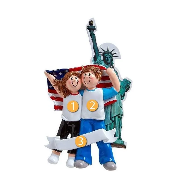 Rudolph & Me Personalized Love in New York Ornament is a great addition to your Christmas tree decor for anyone who loves traveling and wants to remember all of their adventures. This ornament features a couple holding the American flag sightseeing New York City with the Statue of Liberty in the back. Under the couple is a white ribbon that can act as a space for you to create a special message. Great gift idea for a family member or friend who loves to travel and has recently been to New York.