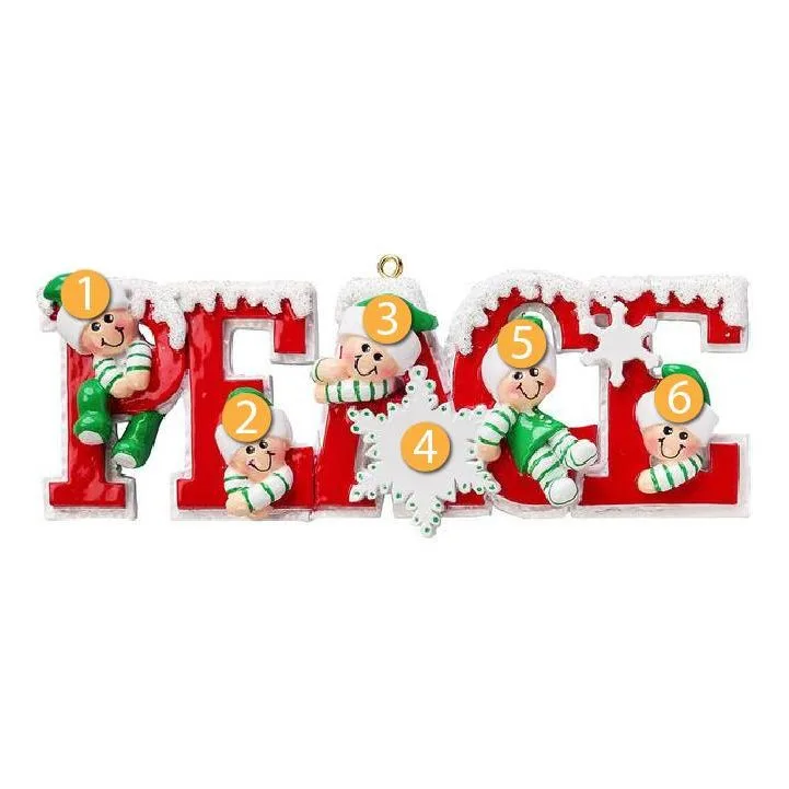 Rudolph & Me Personalized Peace Ornament is the perfect decoration for your Christmas tree this holiday season, celebrating the true meaning of Christmas. This ornament features the word, "Peace," in bold red letters with a family of 5 elves surrounding it. The snowflake acts as a white space for you to create a personalized message. For convenience, this ornament has a small hoop for a ribbon so you can easily place on the tree. A great gift idea for a simple decoration!