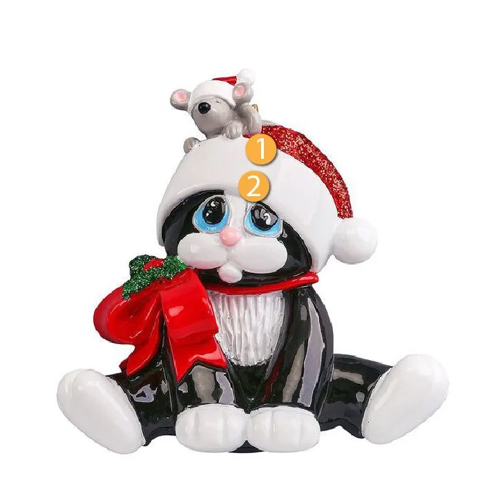 Rudolph & Me Personalized Black Kitty with Mouse Ornament is the perfect decoration for those who want to show some love for their furry friend. This ornament features a festive black cat with a ribbon and holly as its collar playing with a little mouse who is also rocking a Santa hat. The various white spaces act as a spot for personlized messages. Great gift idea for a family member or friend who is a cat lover.