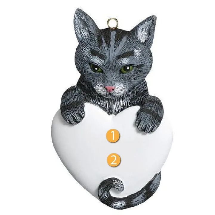 Rudolph & Me Personalized Gray Tabby Cat Ornament is the perfect decoration for those who want to show some love for their furry friend. This ornament features a loveable gray tabby cat holding a white heart, acting as a space for you to write a special personalized message. For convenience, this ornament has a hoop at the top so you can easily thread a ribbon through to place on the tree. Great gift idea for a family member or friend who loves their tabby!