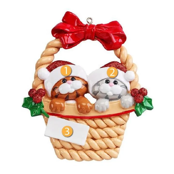 Rudolph & Me Personalized Kitty Couple Ornament is the perfect decoration for those who want to show some love for their furry friends. This ornament features two loveable festive kittens, one orange and one grey, with Santa hats in a woven basket with holly on it. Multiple white spaces act as a spot for you to write a special personalized message. For convenience, this ornament has a hoop at the top so you can easily thread a ribbon through to place on the tree. Great gift idea for a family member or friend who loves cats!