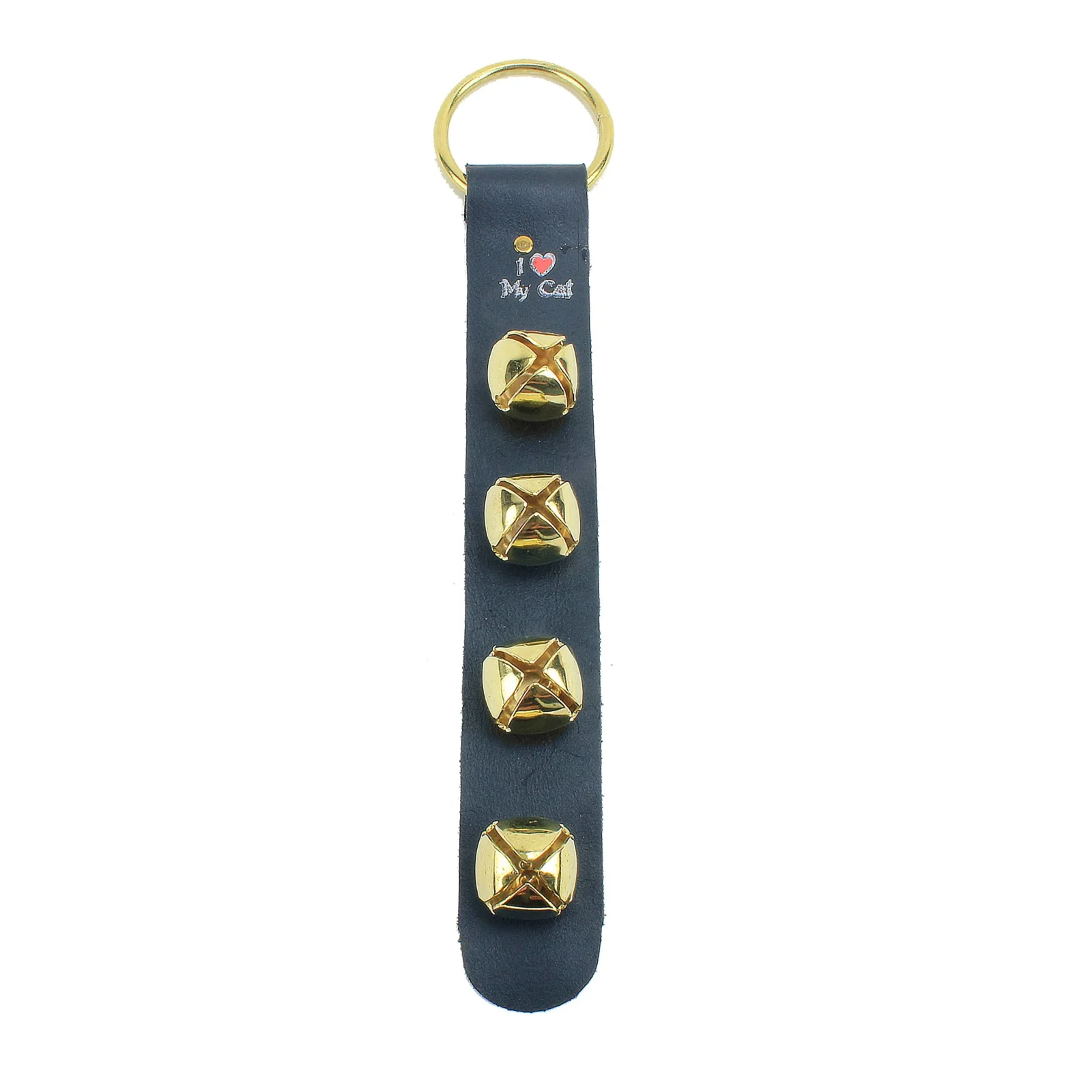Bellmeister I Love My Cat Black Leather Four Bell Door Hanger is great to add to your winter time indoor or outdoor decor. This black leather door hanger is hand-made and painted with the message, "I Heart My Cat," a great way to show some love to your furry friend this winter season. The 3 in. O ring that connects Santa to the door is made from gold brass plated steel and is able to fit over most door handles. Can be placed on doors inside that are commonly used, or ones outside letting you know company has arrived. Perfect idea for a stocking stuffer!