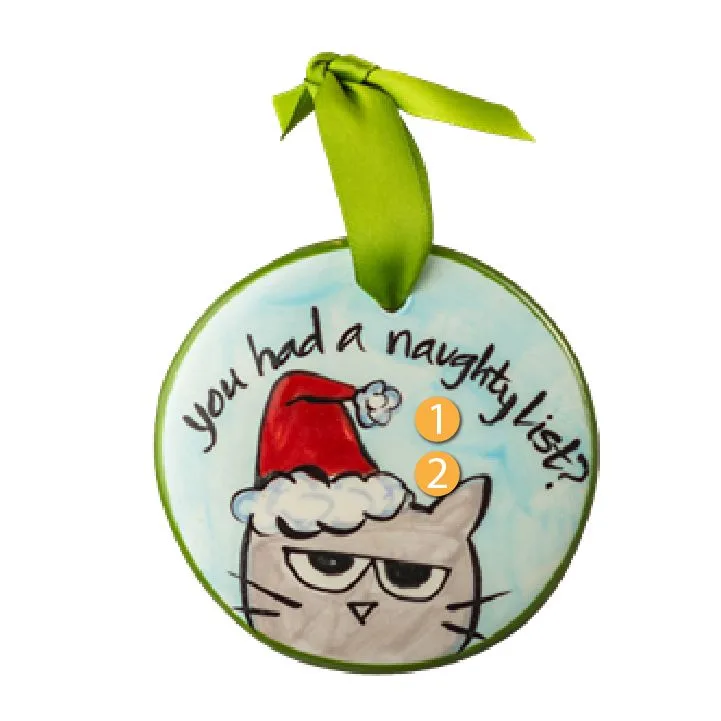 The Nola Watkins Collection consists of unique hand-painted ornaments that are meant to commemorate your accomplishments, milestones, and interests. Made in Southern Virginia since the 1990s, this ceramic collection of ornaments features a flat disk shape that is 1/4 in. thick and 3.5 in. wide. You had a naughty list, along with a festive gray cat, has been individually hand-painted for a one of a kind design that is perfect for the winter and holiday seasons. A bright red ribbon is attached so you can easily hang it on your tree. You can also personalize this ornament with a name or message to add a thoughtful touch to it. Great gift idea for the cat owners in your life!