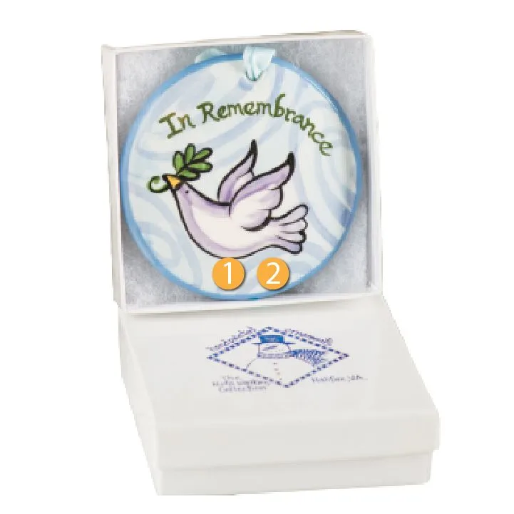 The Nola Watkins Collection consists of unique hand-painted ornaments that are meant to commemorate your accomplishments, milestones, and interests. Made in Southern Virginia since the 1990s, this ceramic collection of ornaments features a flat disk shape that is 1/4 in. thick and 3.5 in. wide. The dove with the "In Remembrance" sentiment has been individually hand-painted for a one of a kind design. A bright red ribbon is attached so you can easily hang it on your tree. You can also personalize this ornament with a name or message to add a thoughtful touch to it. Great gift idea for loved ones you want to remember this winter and holiday season!