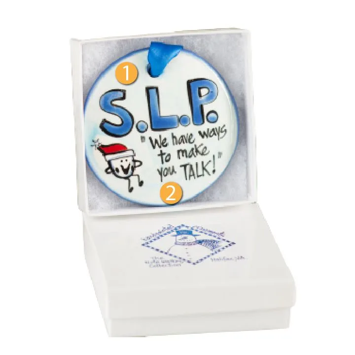 The Nola Watkins Collection consists of unique hand-painted ornaments that are meant to commemorate your accomplishments, milestones, and interests. Made in Southern Virginia since the 1990s, this ceramic collection of ornaments features a flat disk shape that is 1/4 in. thick and 3.5 in. wide. "We have ways to make you talk," along with the S.L.P. abbreviation, has been individually hand-painted for a one of a kind design. A bright red ribbon is attached so you can easily hang it on your tree. You can also personalize this ornament with a name or message to add a thoughtful touch to it. Great gift idea for the speech therapists in your life!